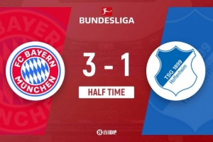 体育资讯2月9日讯 北京时间2月9日0点30分,德甲第21轮,拜仁慕尼黑在主场安联竞技场对阵霍芬海姆。上半场,迪亚斯造点,阿克波古马染红,凯恩点射破门,阿斯拉尼头球中框,诺伊尔失误送礼,克拉马里奇扳平比分,半场结束前迪亚斯再度造点,凯恩点射双响,迪亚斯补时自己打进一球。上半场拜仁慕尼黑3-1霍芬海姆。